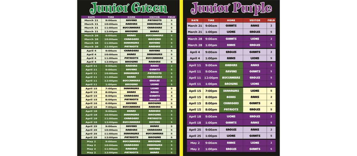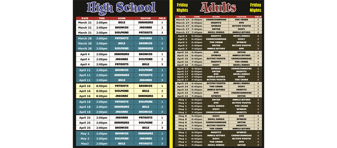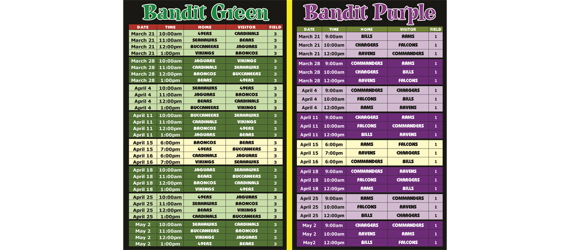All Super Bowl games will be played on May 18th.9am - Peewee Super Bowl - field 69am - Junior Super Bowl - field 410am - Bandit Super Bowl - field 210am - Adult Super Bowl - field 410am - Varsity Super Bowl - field 511am - Gremlin...